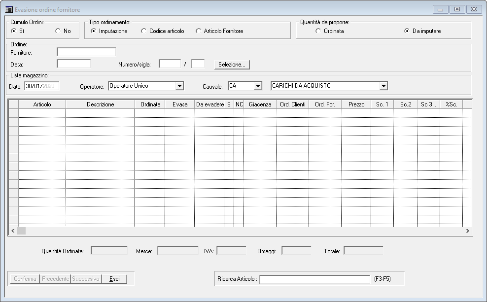 Tramite questo programma si procede con l'evasione degli ordini a fornitori e la generazione del relativo movimento di carico in magazzino.