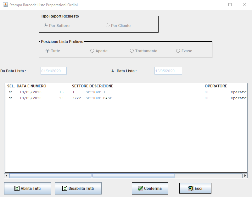 Dopo aver confemato la selezione, nel riquadro in basso appariranno tutti gli ordini trovati i quali potranni essere abilitati o meno per l'elaborazione, tramite i bottoni e