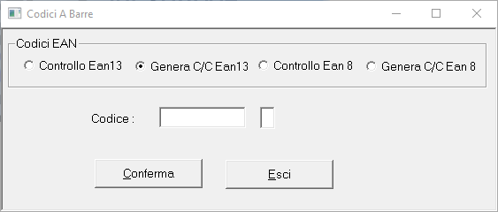 Il programma che segue serve per effettuare sia la verifica che la generazione del codice di controllo dei codici a barre Ean13 e Ean8.
