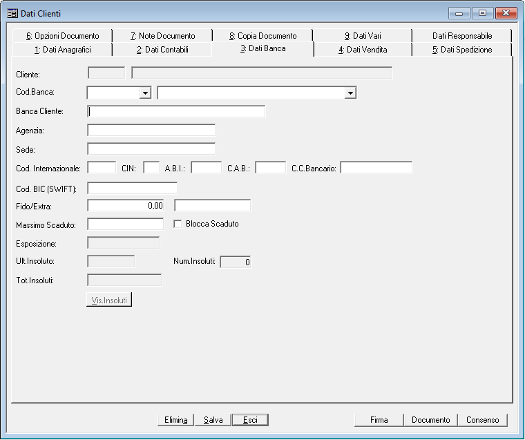 Questa cartella contiene tutti i dati relativi alla Banca di appoggio del cliente ed i progressivi riferiti ad eventuali insoluti ed esposizione.