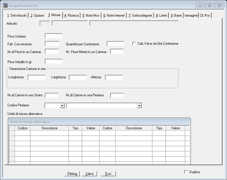 Peso Unitario: campo numerico di 10 caratteri nel quale è possibile inserire il peso dell'articolo in grammi nel caso in cui si voglia ottenere automaticamente il peso complessivo in fase di fatturazione/bollettazione;