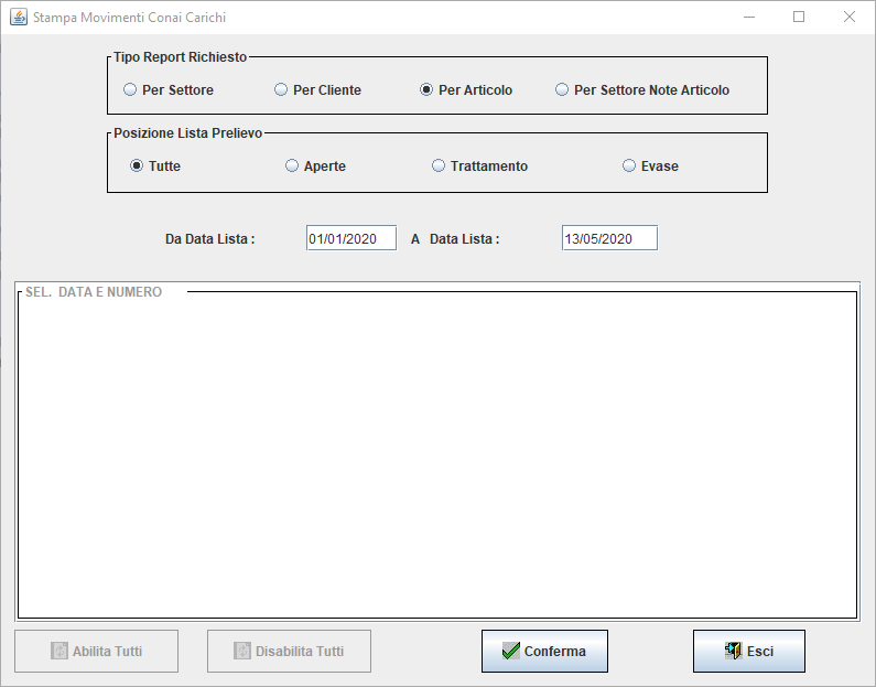 Questo programma permette di stampare le singole liste di prelievo, raggruppate per Settore, Cliente, Articolo o Note articolo.