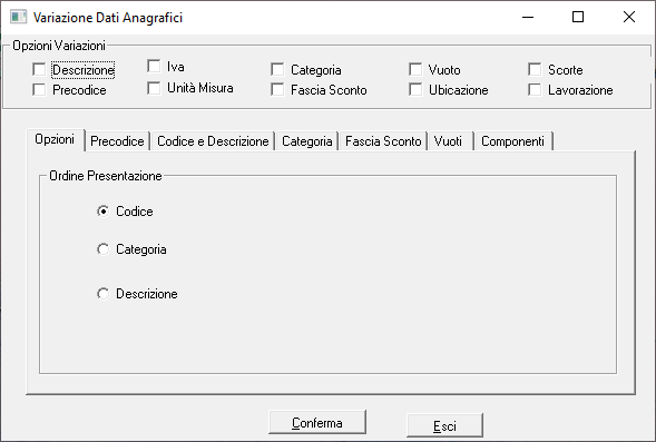 Opzioni Variazioni: attivare i dati da modificare (es.: Categoria - Ubicazione)